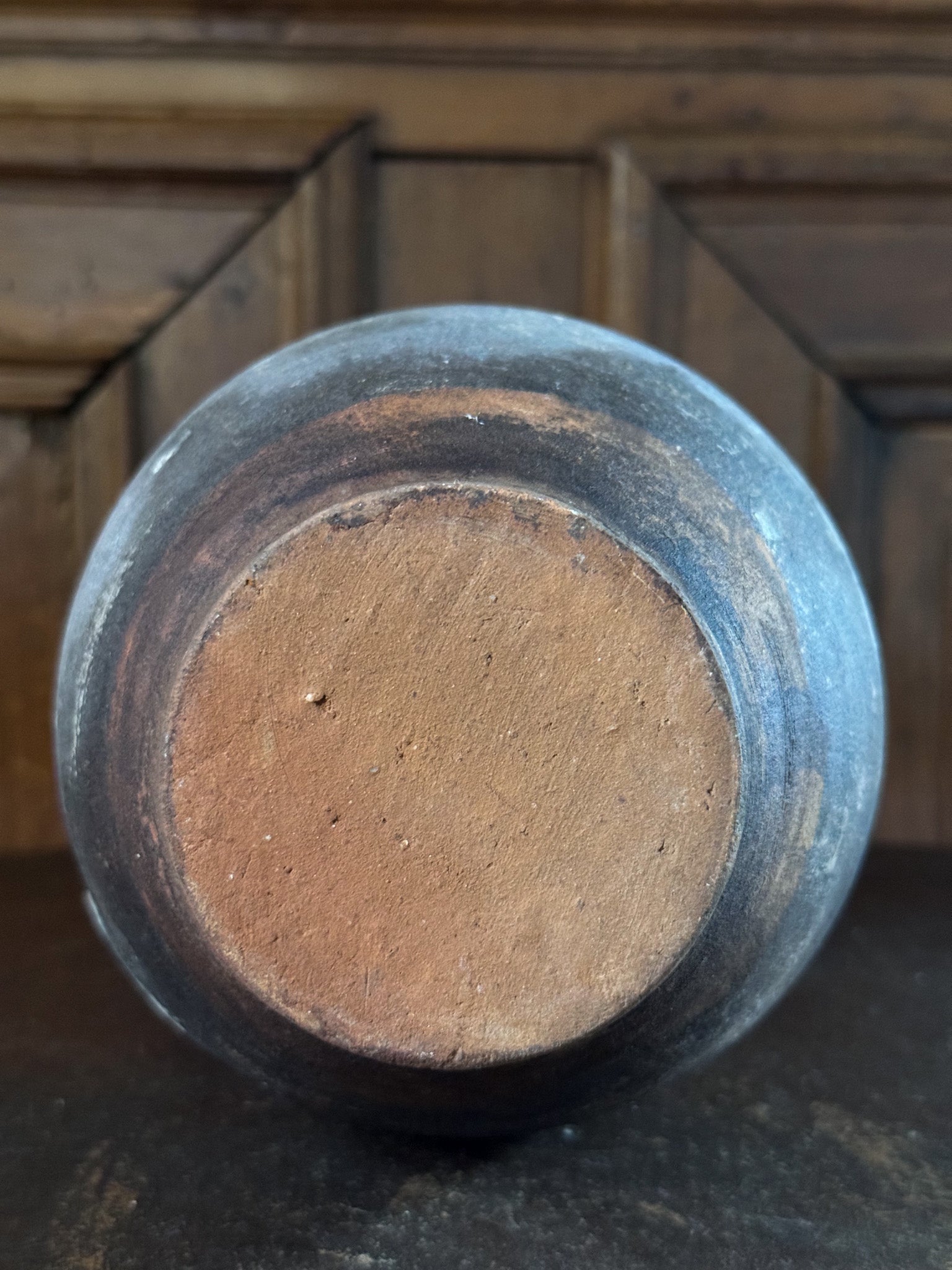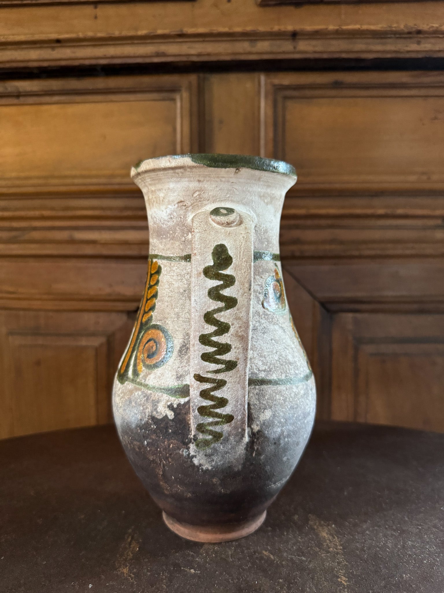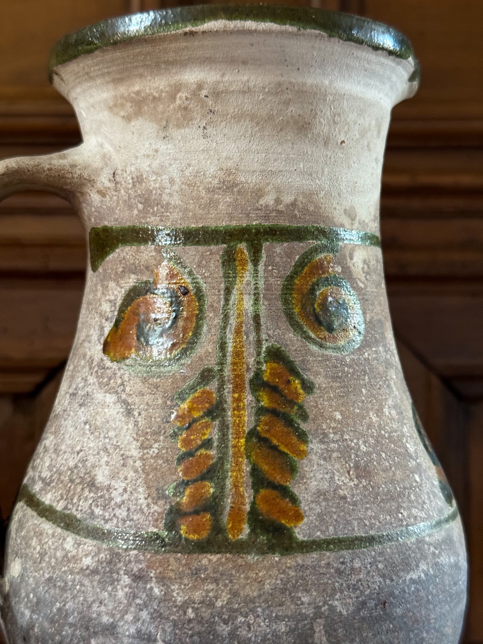 Haut pichet en céramique émaillée de bruns et de gris et d’une frise stylisée.