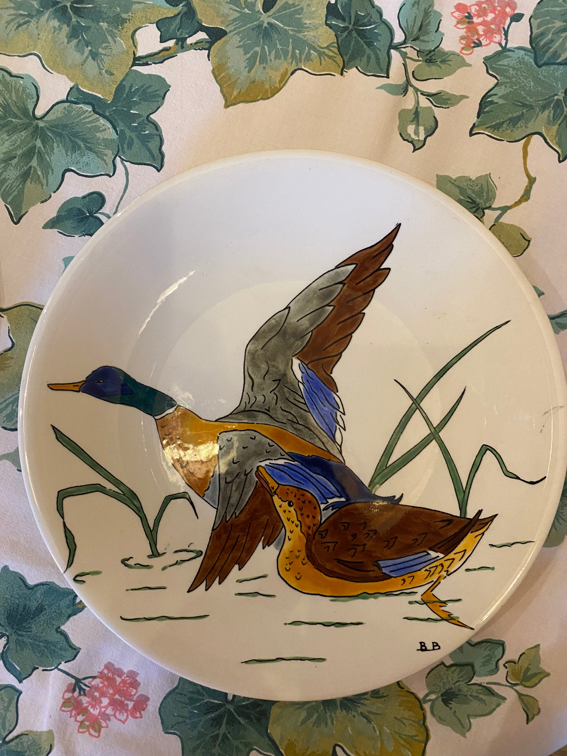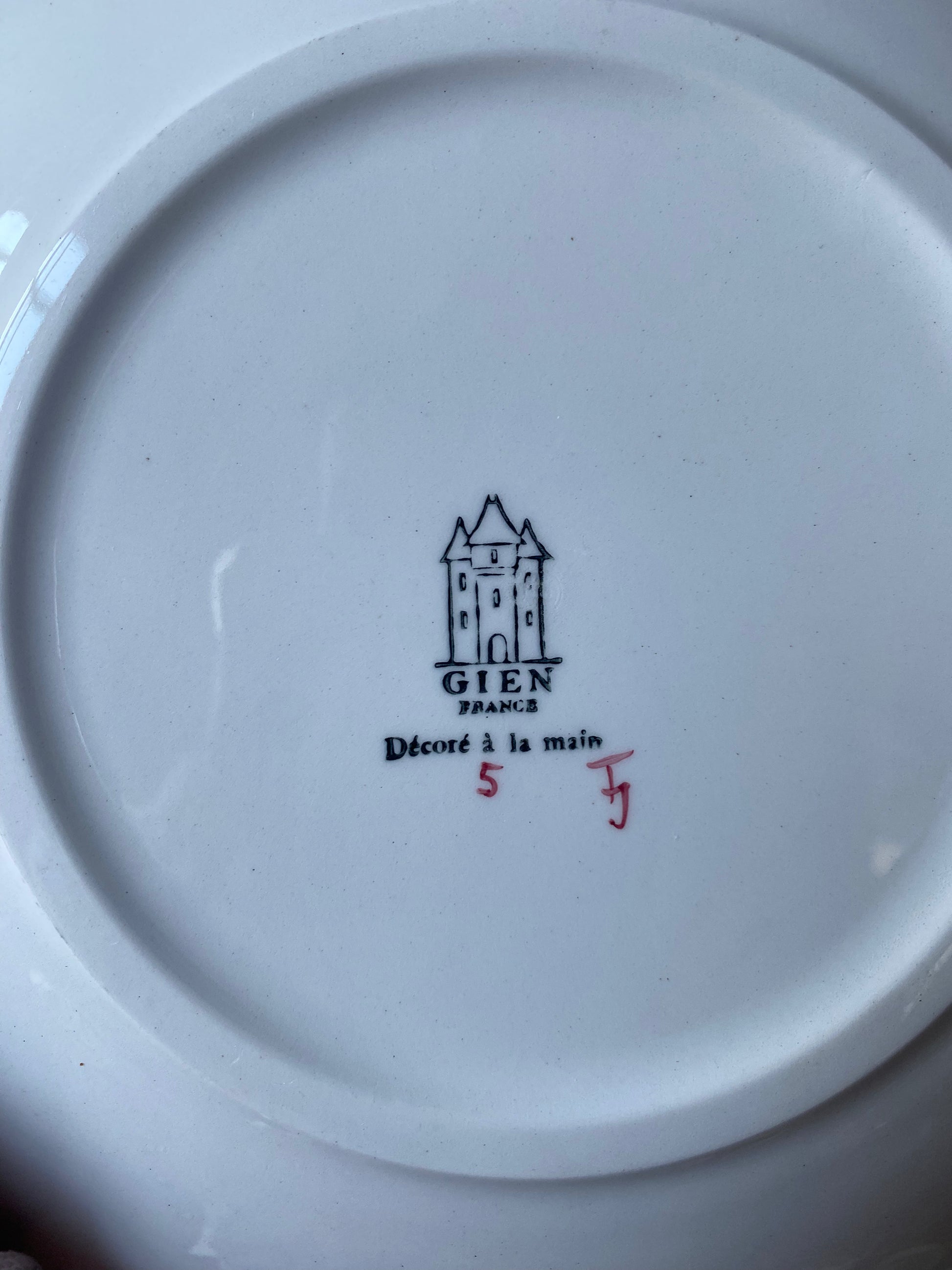 Paire d’assiettes à décor d’oiseaux signées BB. Tampon de « Gien decoré à la main » au dos.